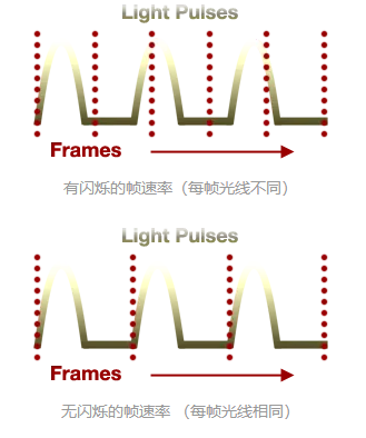 盡管光源的光線看上去是連續(xù)的,但實(shí)際上許多光源是以高頻脈沖的形式按著一定時(shí)間間隔時(shí)斷時(shí)續(xù)地來發(fā)光的。當(dāng)快門速度和幀率捕捉到光脈沖的不同部分,就會(huì)產(chǎn)生閃爍: