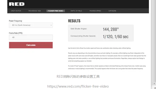 按照供電頻率和幀率,如果想避免閃爍,可能需要設(shè)置非常規(guī)的快門速度。例如,如果在供電頻率60Hz的照明下,你想設(shè)置一個(gè)不常用的幀率,比如說7 fps,那189°的快門角度會(huì)比較合適(通過前文提到的RED消除閃爍的參數(shù)設(shè)置工具計(jì)算得出)。