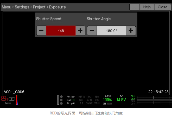 以RED攝影機(jī)為例,你可以用快門速度和快門角度來控制。快門速度通過秒或幾分之一秒來表示時(shí)間的長短。快門角度則是運(yùn)動(dòng)捕捉中一個(gè)獨(dú)特的術(shù)語,它闡述了快門速度與幀速率之間的關(guān)系。