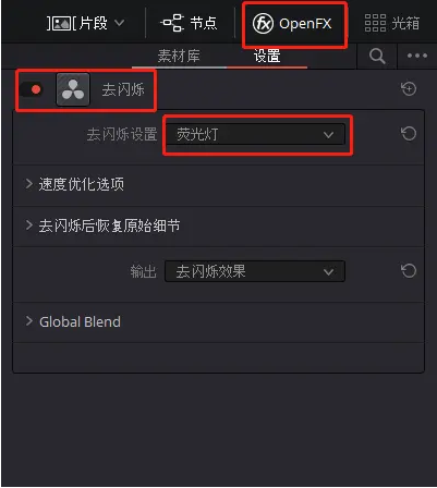 然后點(diǎn)擊[ Open FX ],添加[ 去閃爍 ]效果,去閃爍設(shè)置選擇[ 熒光燈 ]即可,也可以選擇[ 高級(jí)控制 ]來調(diào)整得更細(xì)致一些。